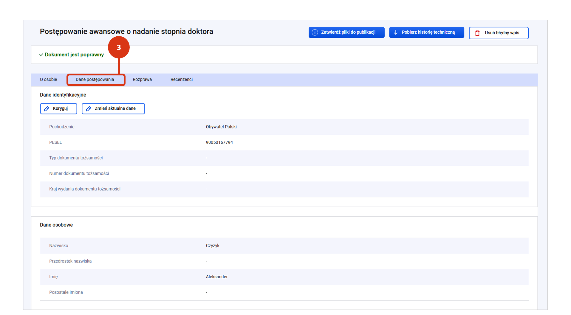 Aby skorygować dane osobowe, wybierz przycisk „Edytuj” w sekcji „O studencie” w podsekcji „Dane aktualne”. Następnie kliknij w przycisk „Popraw błędy”.
