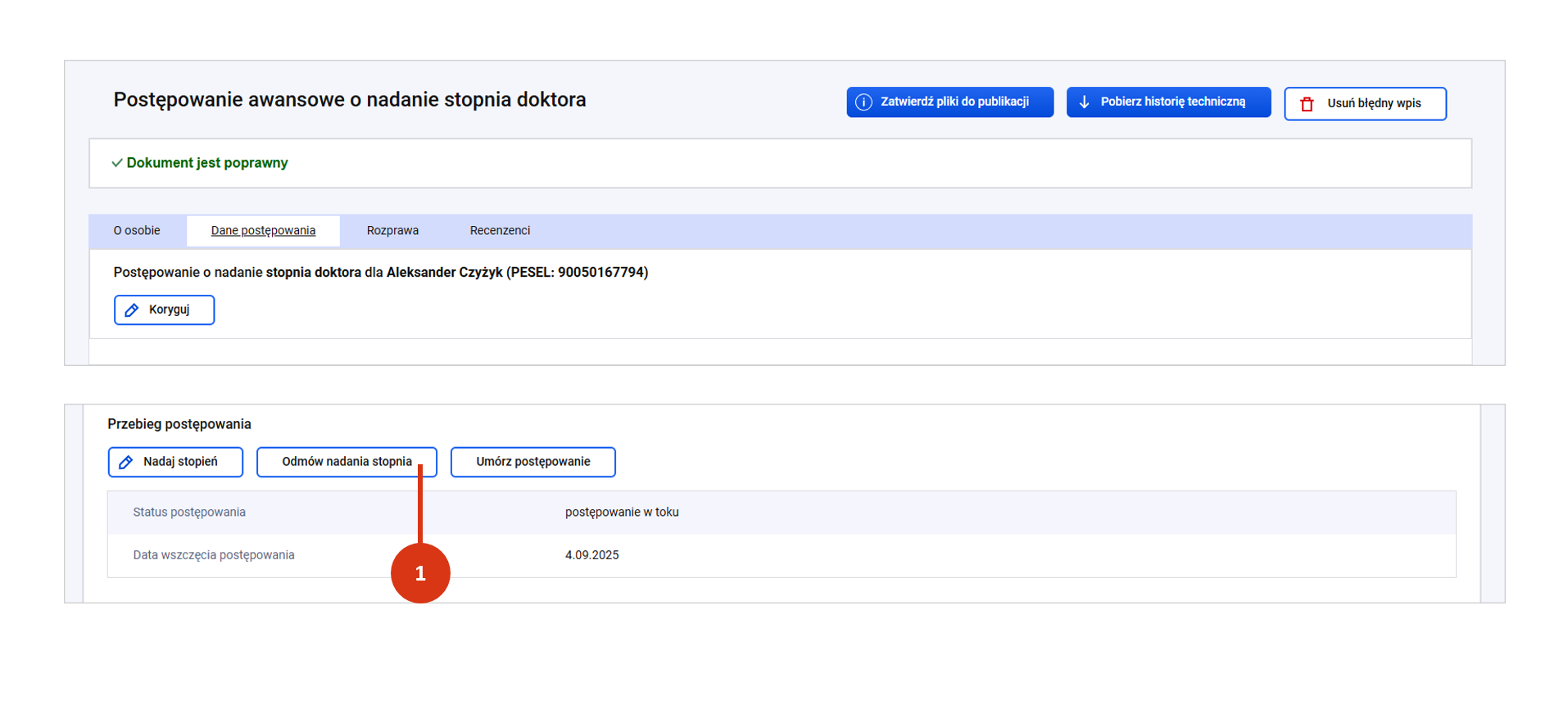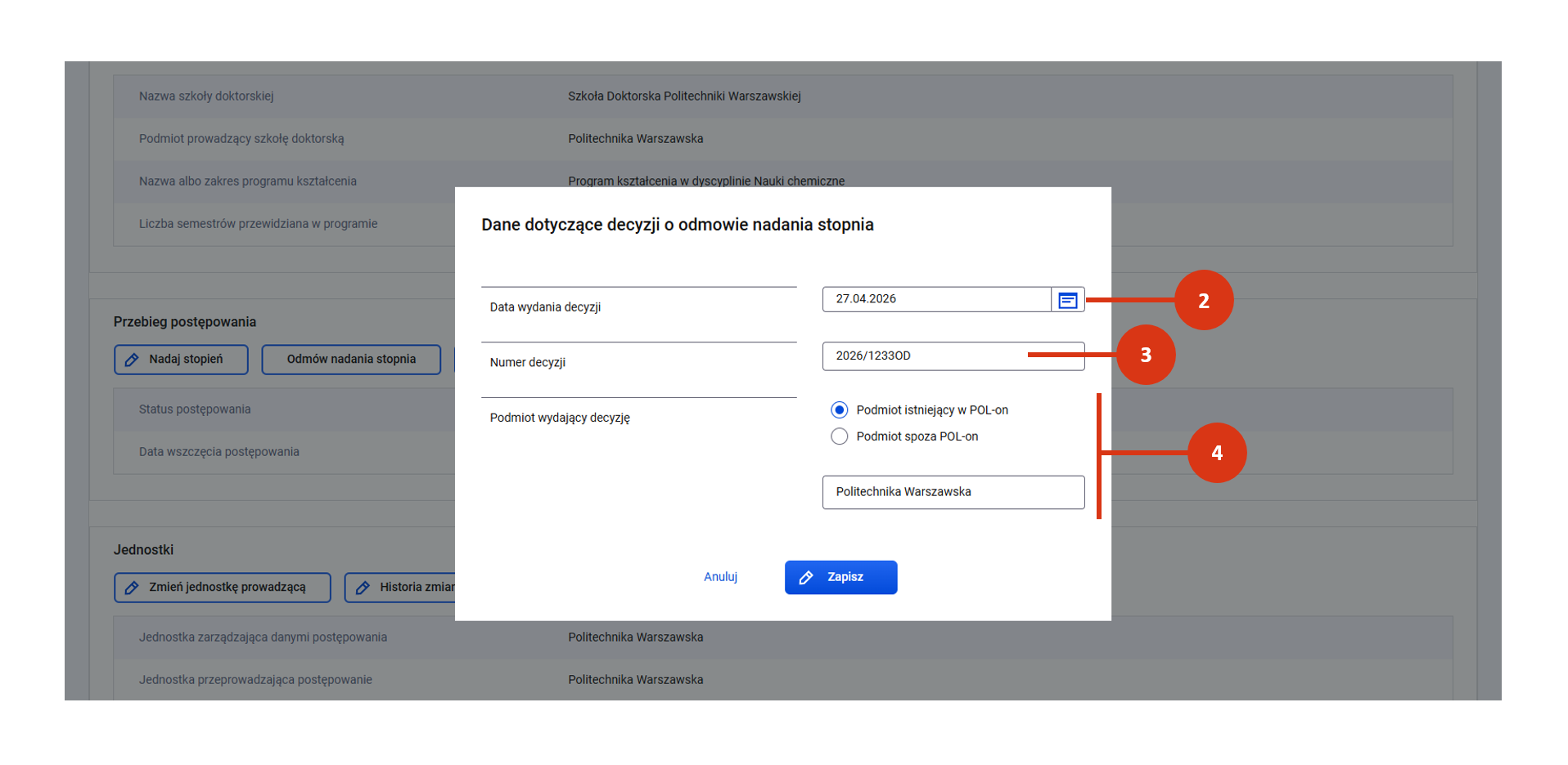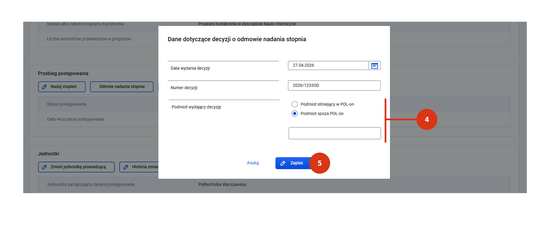 W naszym przykładzie zmieniamy nazwisko studentki z „Testowa” na „Testowa-Nowak”. Jako datę obowiązywania zmiany podajemy datę powzięcia informacji o zmianie (data od kiedy na danej uczelni studentka zaczęła się posługiwać nowymi danymi tzn. data kiedy poinformowała o zmianie danych).