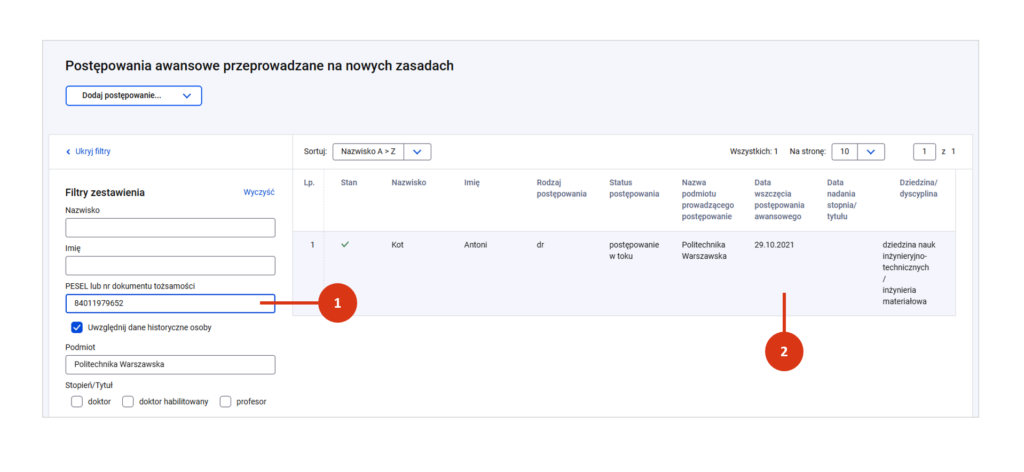 Stan danych postępowania znajdziesz wpierwszej kolumnie zestawienia (przy danym postępowaniu awansowym). Będzie to jedna z ikon: