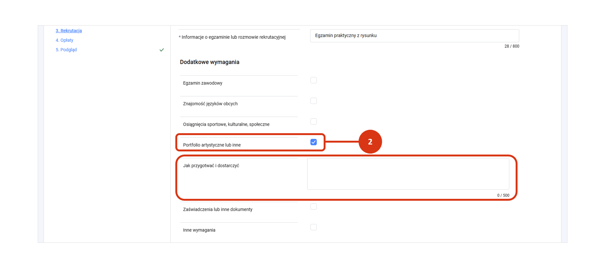 W zakresie danych o egzaminie wstępnym lub rozmowie rekrutacyjnej, wskaż czy są one wymagane (Tak/Nie). Jeśli wskażesz „Tak”, wprowadź ręcznie informacje o egzaminie lub rozmowie rekrutacyjnej [1]. Jest to pozycja obowiązkowa.