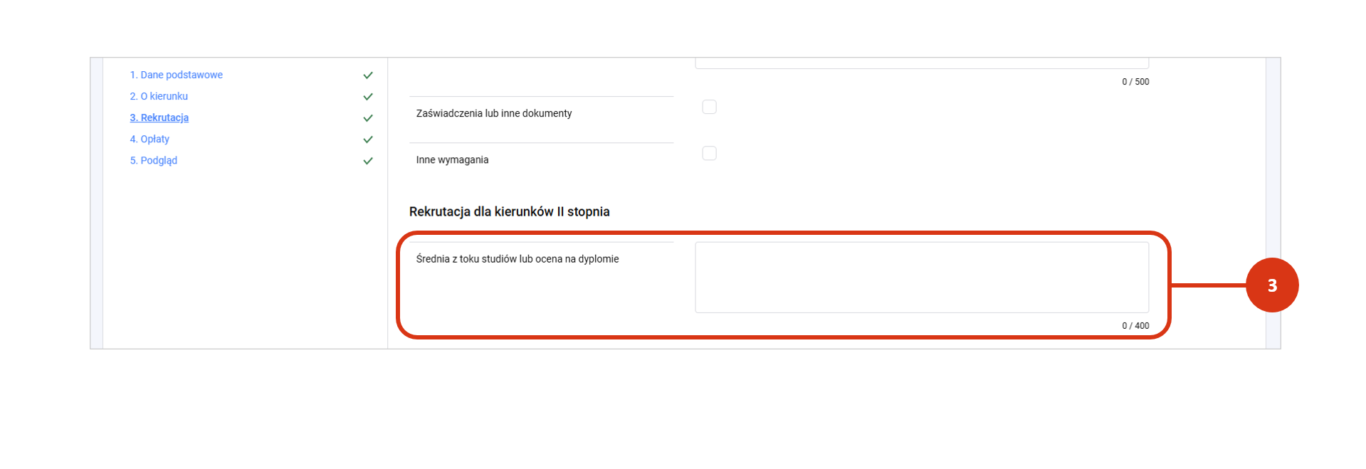 W kolejnym kroku możesz dodać informację dotyczącą wymogów Rekrutacji dla kierunków II stopnia, uzupełniając średnią z toku studiów lub ocenę na dyplomie [3].