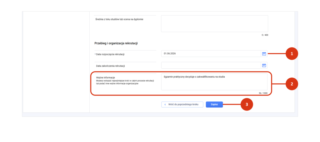Na koniec możesz podać ważne informacje dotyczące organizacji procesu rekrutacyjnego [2] (pole do 1000 znaków).