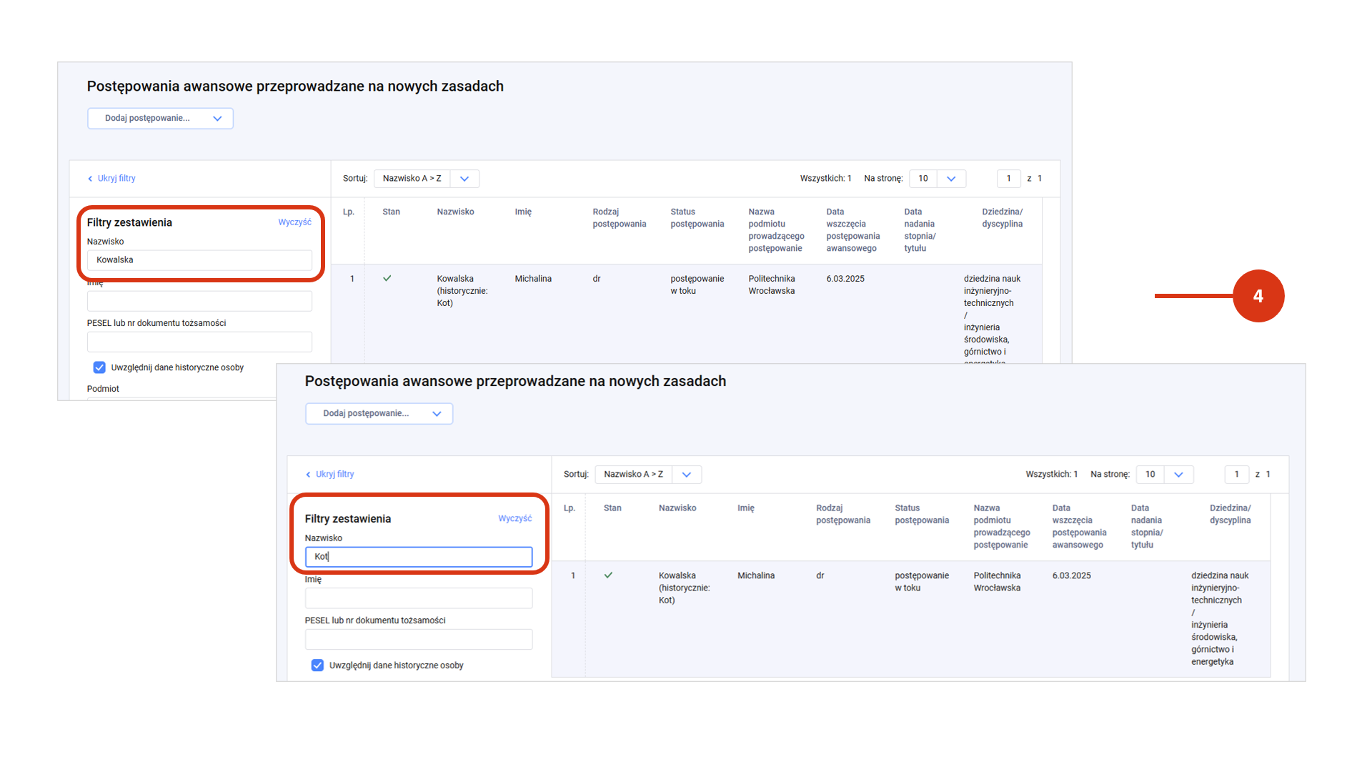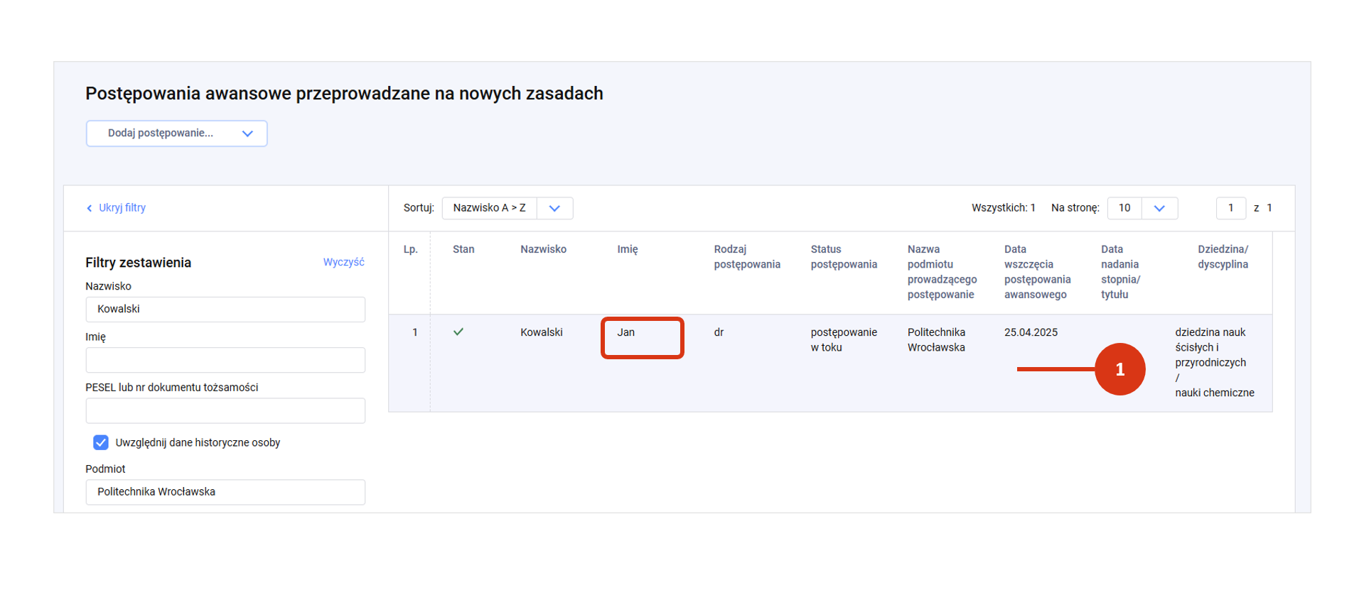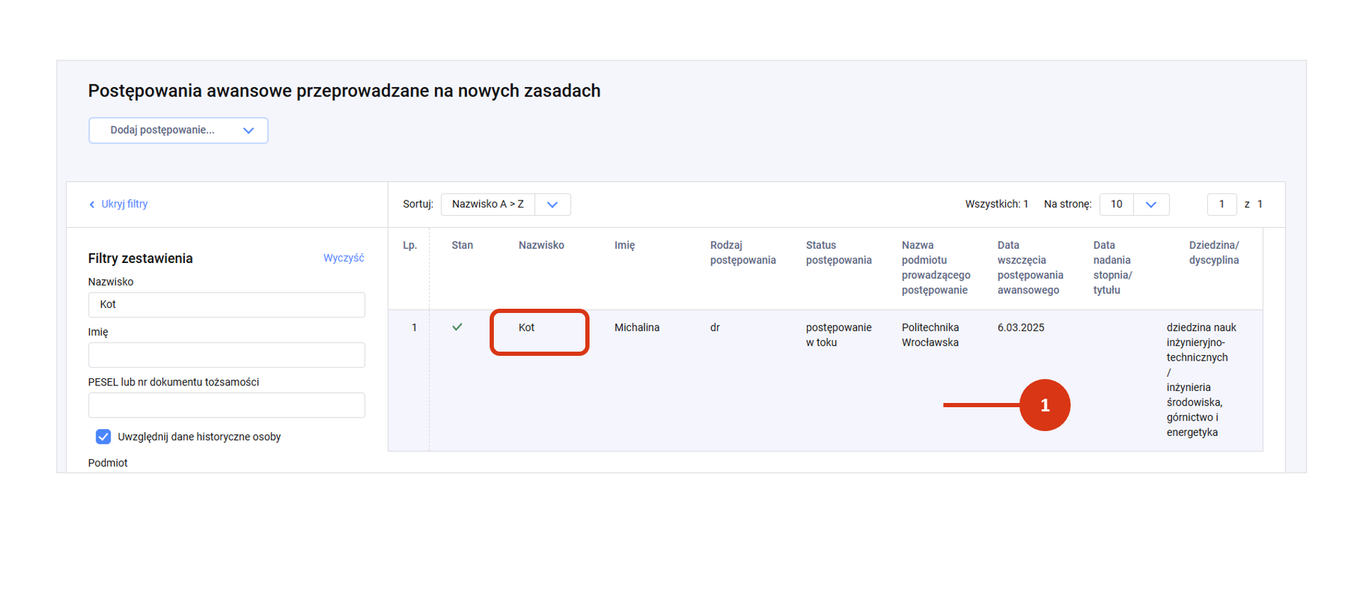 Znajdź rekord postępowania, który wymaga aktualizacji danych osobowych za pomocą filtrów zestawienia i przejdź do jego szczegółów [1].