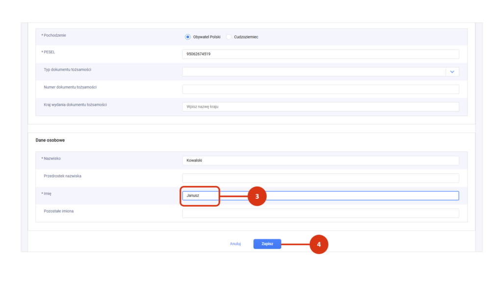 Popraw błąd lub uzupełnij wybrane pola w formularzu [3]. Zapisz dane [4].