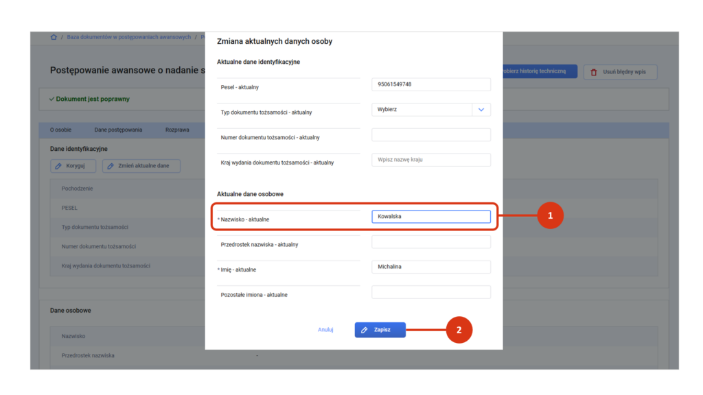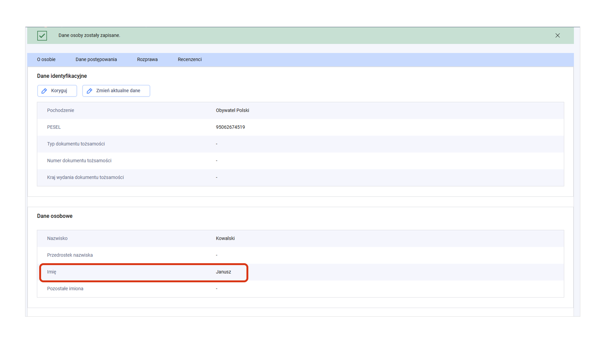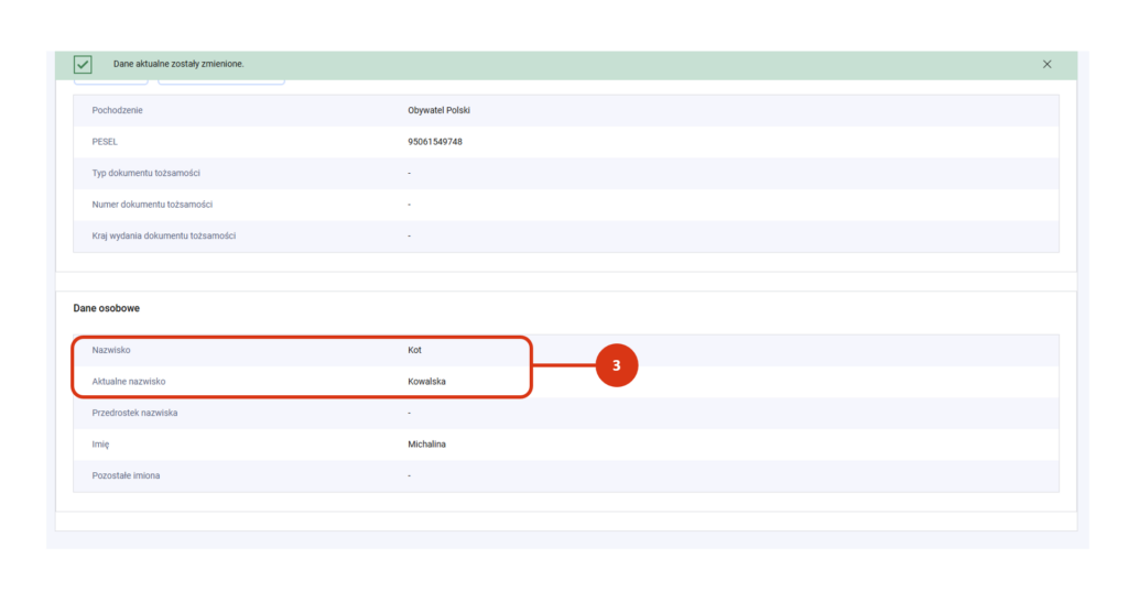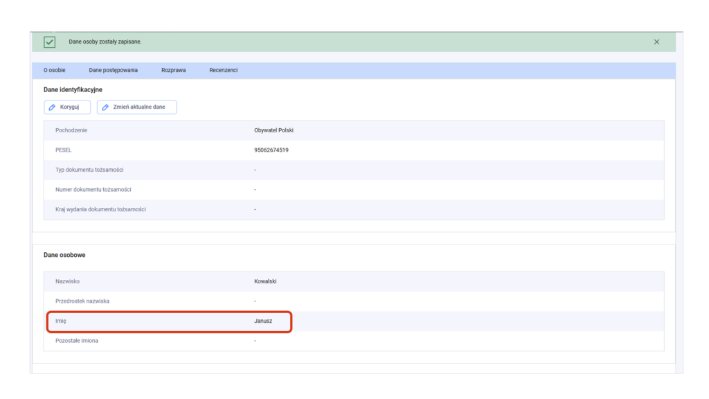 W ten sam sposób możesz odzwierciedlić w rekordzie zmianę danych identyfikacyjnych osoby (otrzymanie PESELu).