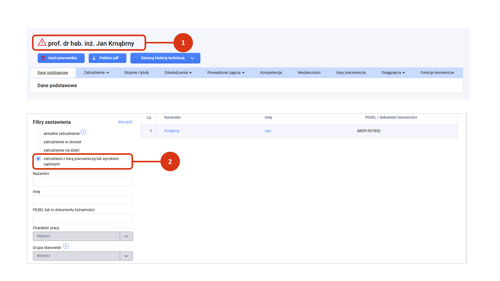 Aby zarejestrować karę lub wyrok osobie wprowadzonej do modułu Pracownicy, odnajdź rekord za pomocą filtrów [1] i przejdź do jego szczegółów [2].