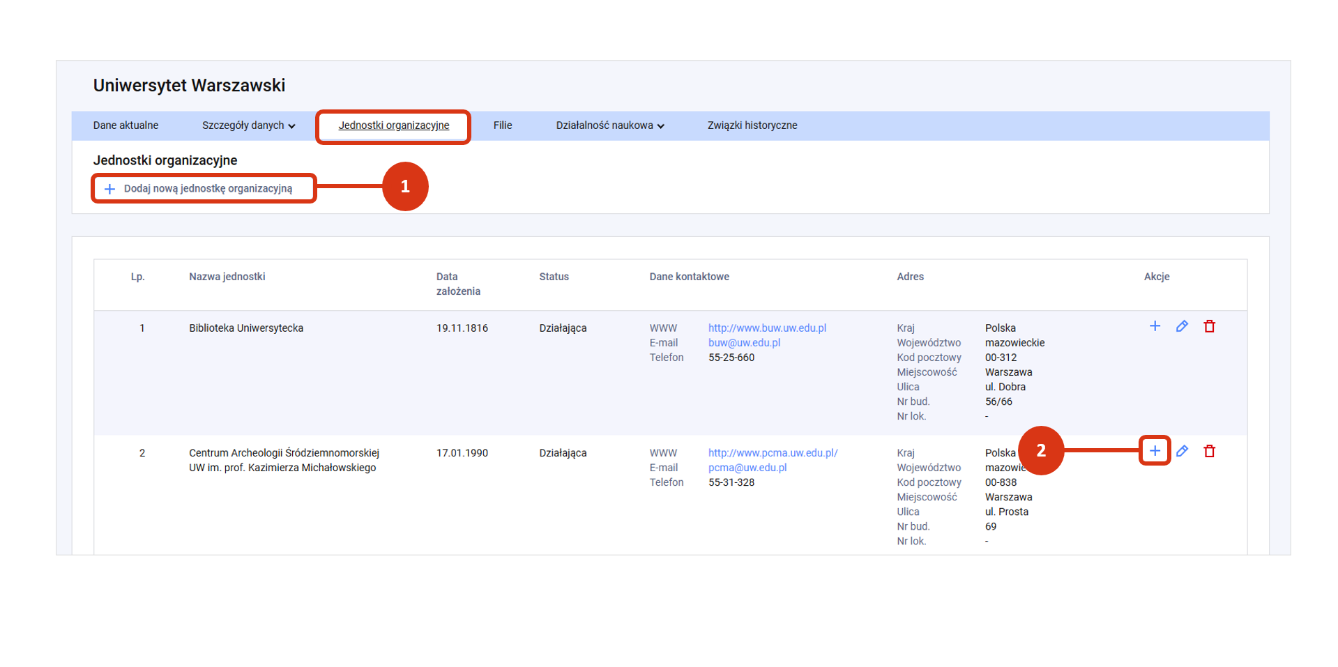 - dodać nową jednostkę organizacyjną za pomocą przycisku „Dodaj nowa jednostkę organizacyjną” [1],
