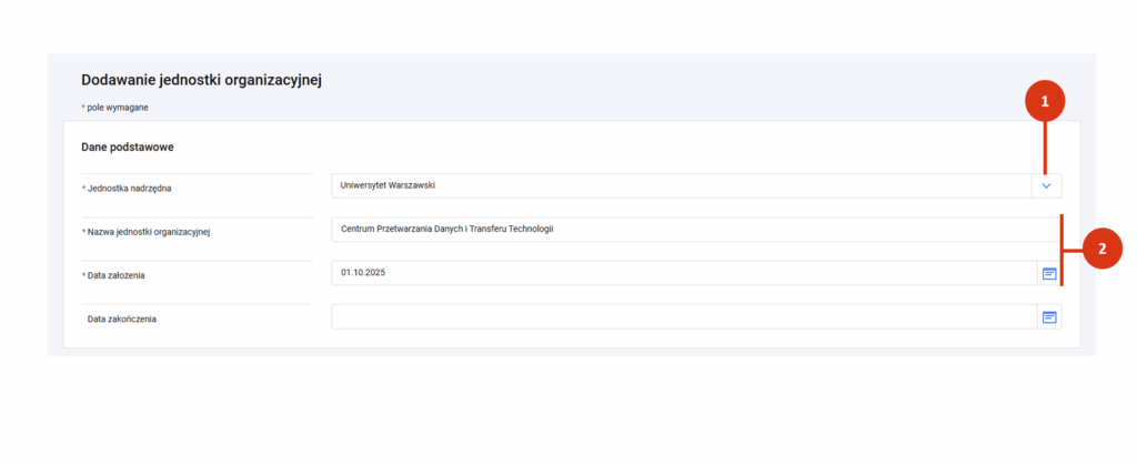 W zależności od wybranej ścieżki – w formularzu znajdziesz odpowiednią nazwą jednostki nadrzędnej [1]. Uzupełnij formularz w zakresie danych wymaganych. Są to [2]: