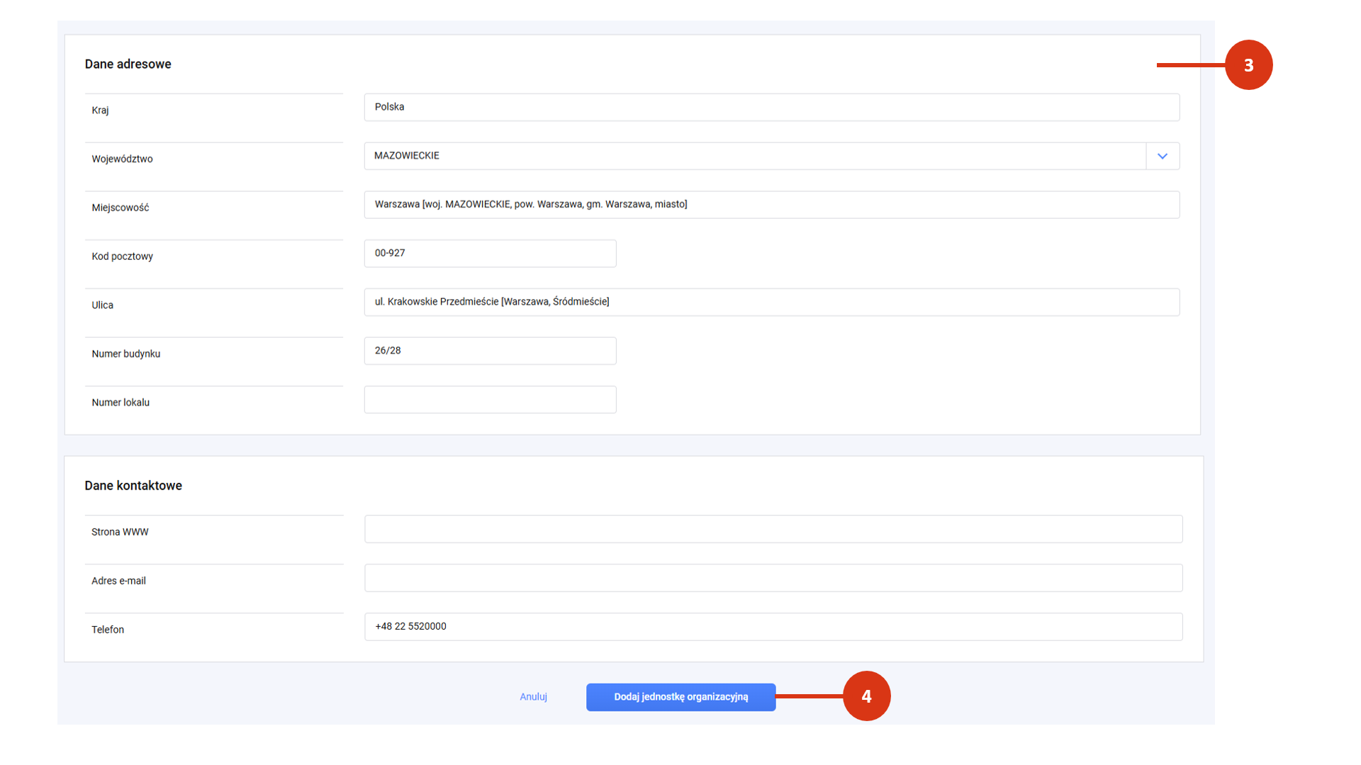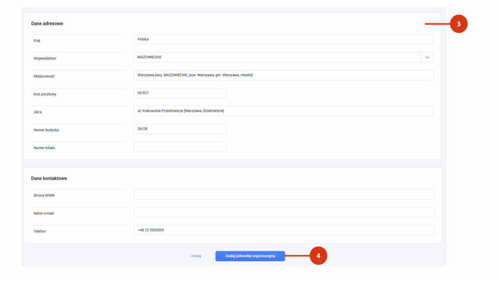 Na koniec zapisz formularz za pomocą przycisku „Dodaj jednostkę organizacyjną” [4].