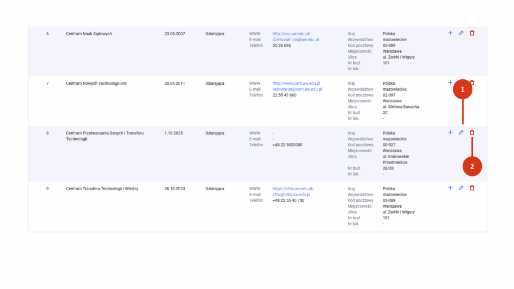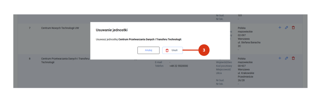 Po kliknięciu w ikonę śmietnika przy wybranej jednostce, będziesz musiał potwierdzić chęć usunięcia [3]. Czynność ta jest nieodwracalna.