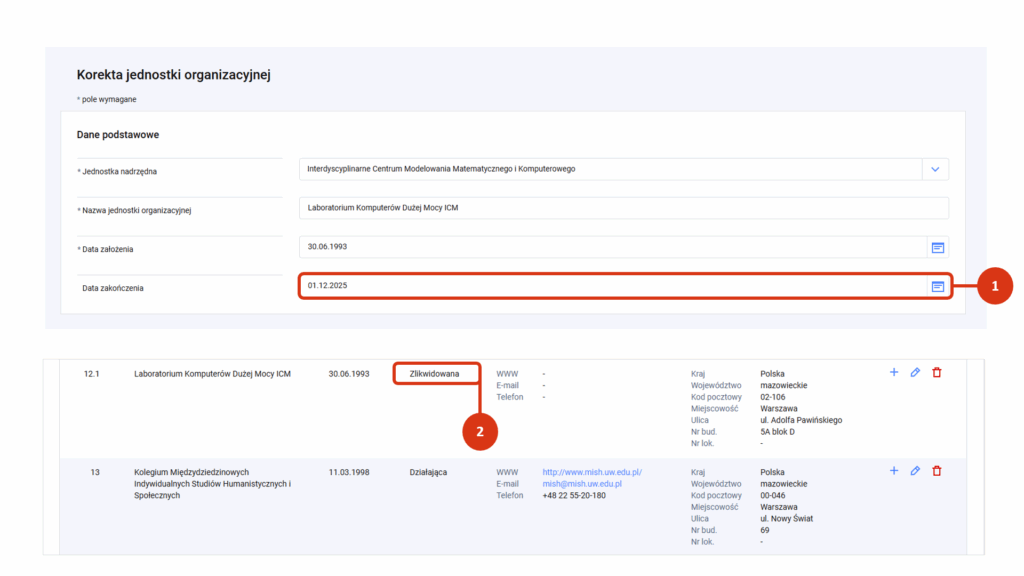 Jeśli jednostka zakończyła swoją działalność, wprowadź datę zakończenia działalności jednostki [1]. Po zapisie status jednostki zmieni się z „Działająca” na „Zlikwidowana” [2].