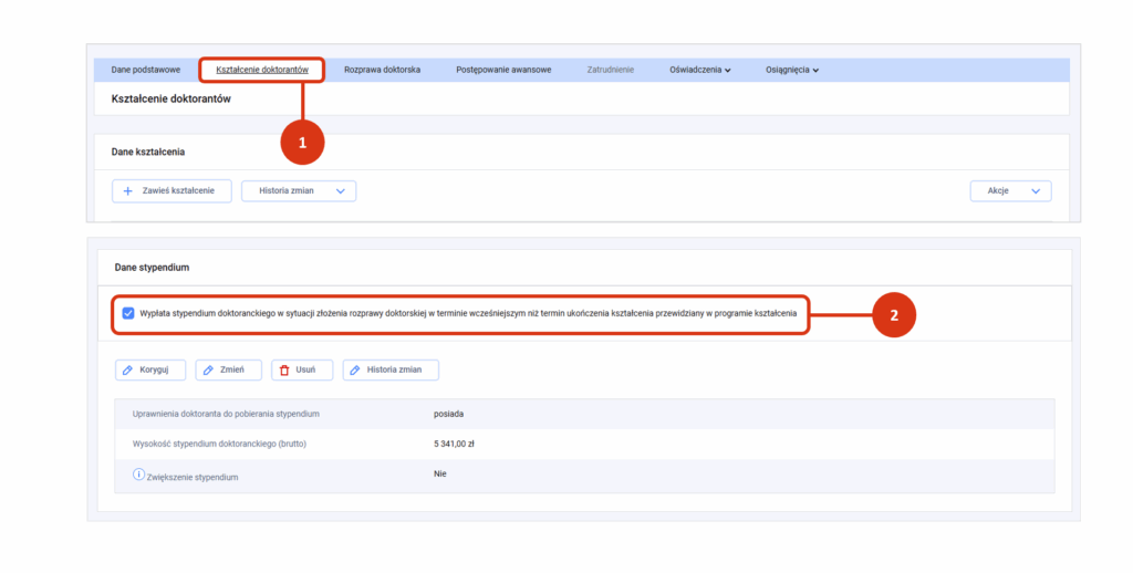 Jeśli doktorant złoży rozprawę doktorską w terminie wcześniejszym niż termin ukończenia kształcenia przewidziany w programie kształcenia, przejdź do zakładki Kształcenie doktoranta [1] i oznacz właściwy checkbox w sekcji Dane stypendium [2].