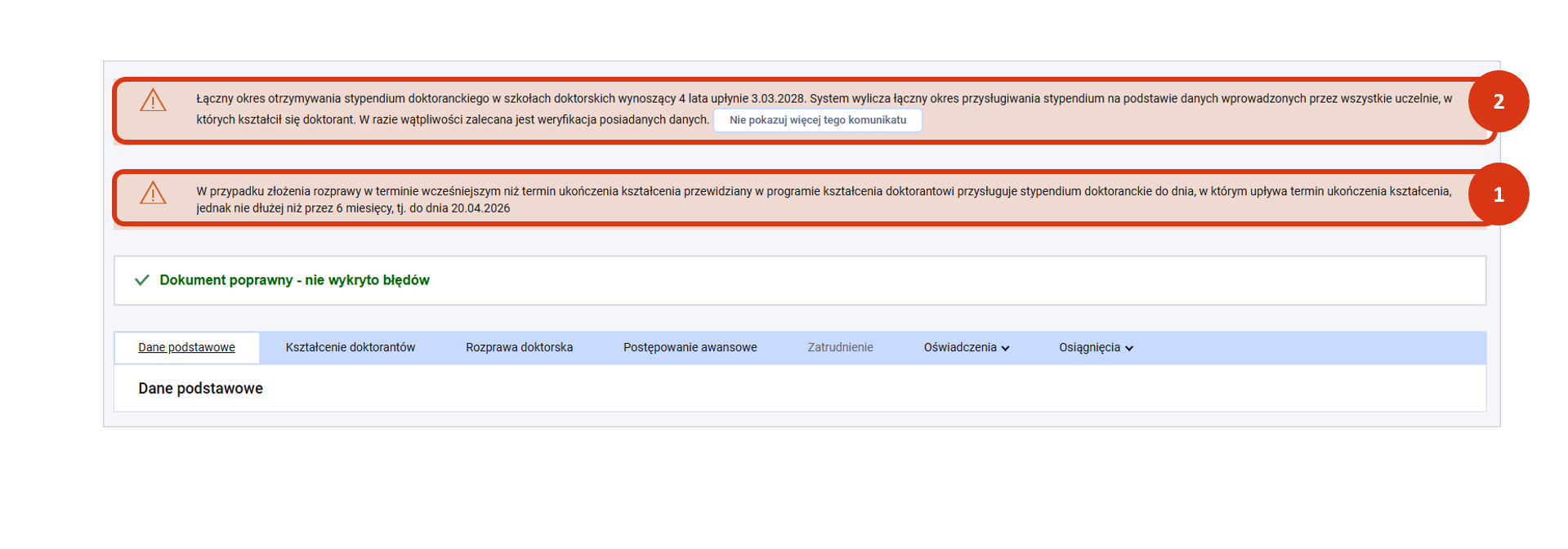 Na potrzebę oznaczania wypłacania stypendium doktoranckiego w sytuacji złożenia rozprawy doktorskiej w terminie wcześniejszym niż termin ukończenia kształcenia przewidziany w programie kształcenia pojawia się dodatkowa walidacja weryfikująca [3] czy: