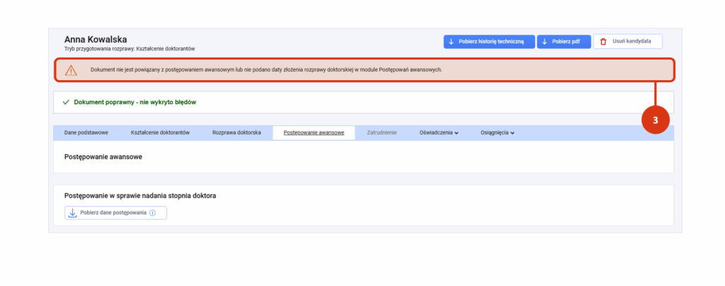- rekord doktoranta został powiązany z postępowaniem w module Postępowania awansowe,