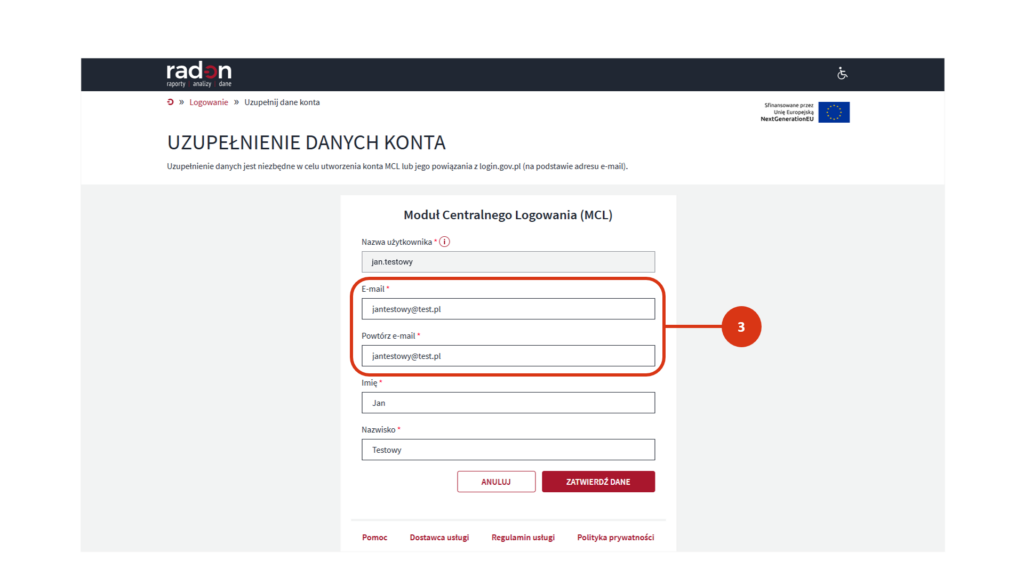 W kolejnym kroku uzupełnij dane konta [3]. Uzupełnienie danych jest niezbędne w celu powiązania z login.gov.pl (na podstawie adresu e-mail).
