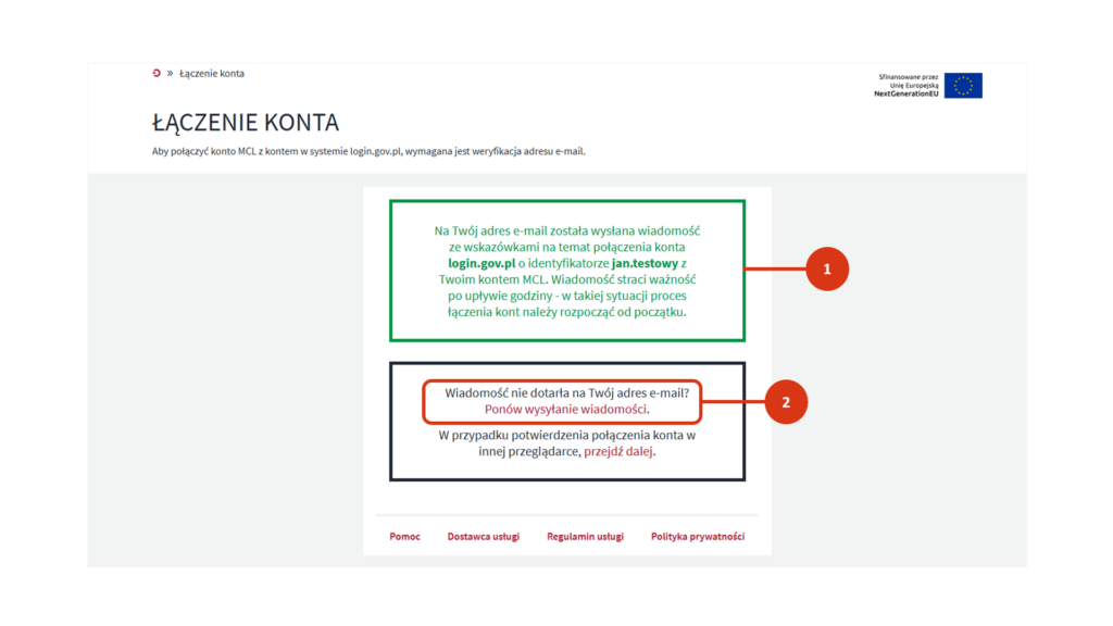 Na podany w formularzu adres mailowy [1] zostanie wysłana wiadomość systemowa. Przejdź do skrzynki pocztowej i zapoznaj się ze wskazówkami dotyczącymi połączenia konta login.gov.pl z kontem MCL. Wiadomość będzie miała ważność czasową!