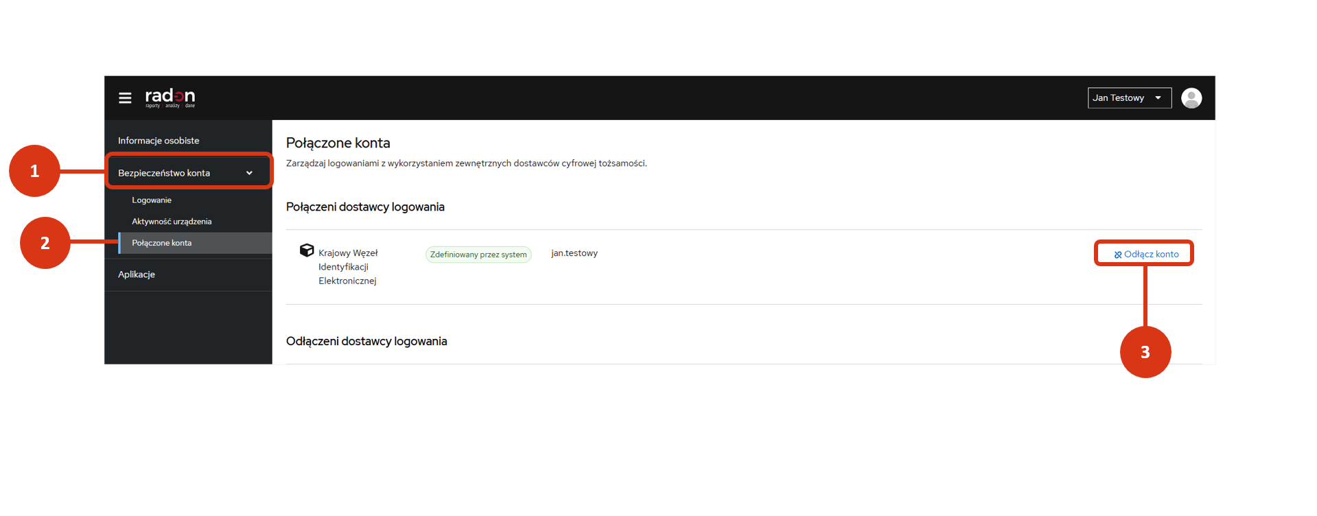 Gdybyś chciał odłączyć konto login.gov.pl od MCL zaloguj się Krajowym Węzłem Identyfikacji Elektronicznej, a następnie przejdź do konta Modułu Centralnego Logowania (https://mcl.opi.org.pl/). Wybierz sekcję „Bezpieczeństwo konta” [1], a następnie „Połączone konta” [2]. Użyj akcji „Odłącz konto” [3]. Powiązanie pomiędzy Krajowym Węzłem Identyfikacji Elektronicznej a kontem MCL zostanie utracone.