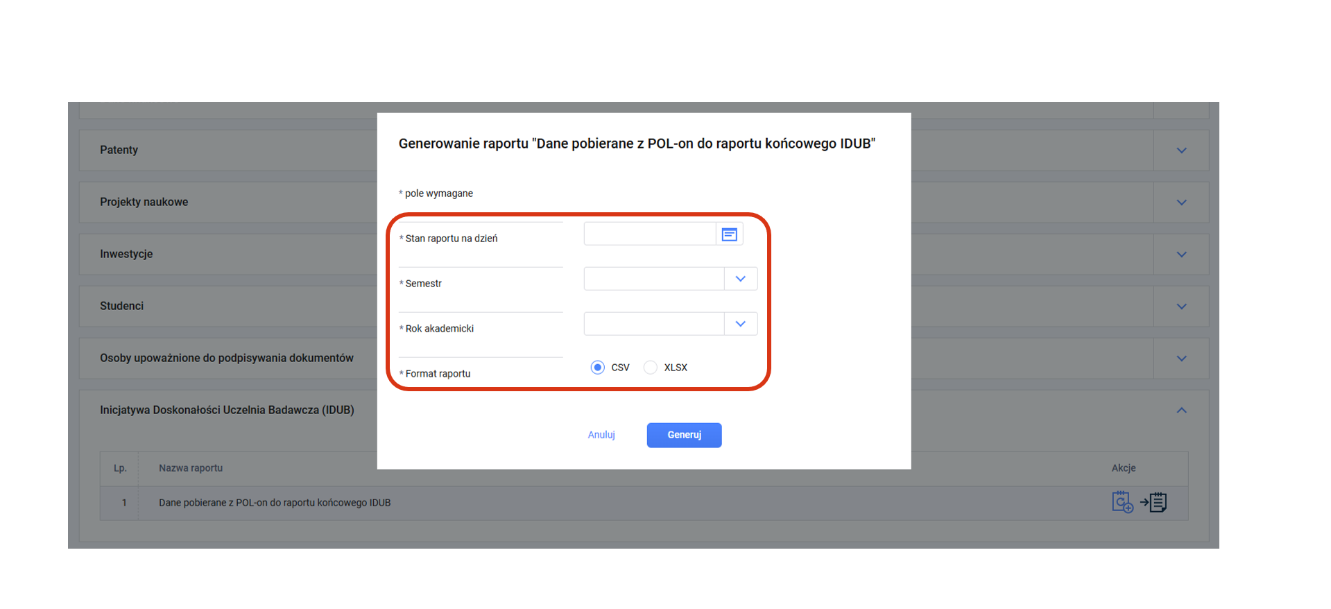 W tym artykule znajdziesz ogólne informacje o raportach możliwych do wygenerowania w module Raporty, w obszarze Inicjatywa Doskonałości Uczelnia Badawcza (IDUB).