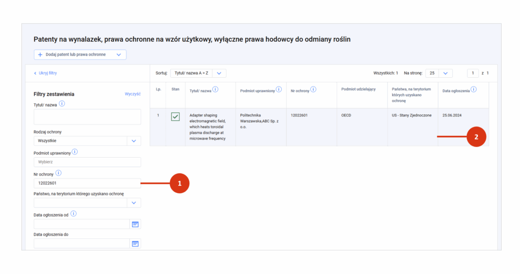 Odnajdź rekord w wykazie patentów i praw ochronnych za pomocą filtrów zestawienia [1] i przejdź do jego szczegółów [2].