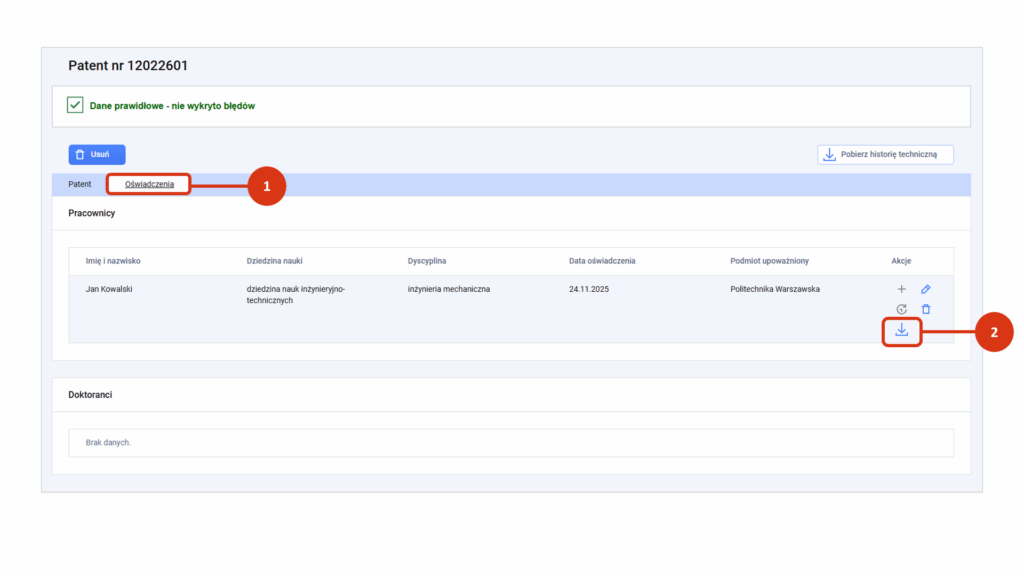 Aby pobrać historię techniczną oświadczenia upoważniającego, przejdź do zakładki „Oświadczenia” [1], a następnie użyj ikony pobrania (strzałka skierowana w dół), dostępnej w kolumnie „Akcje”, przy danych osoby z twojego podmiotu [2].
