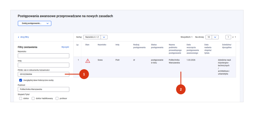 Aby zarejestrować dane rozprawy doktorskiej zaloguj się do systemu. Wybierz z menu moduł Postępowania awansowe. Odszukaj rekord postępowania awansowego w zestawieniu postępowań przeprowadzanych na nowych zasadach [1] i przejdź do jego szczegółów [2].