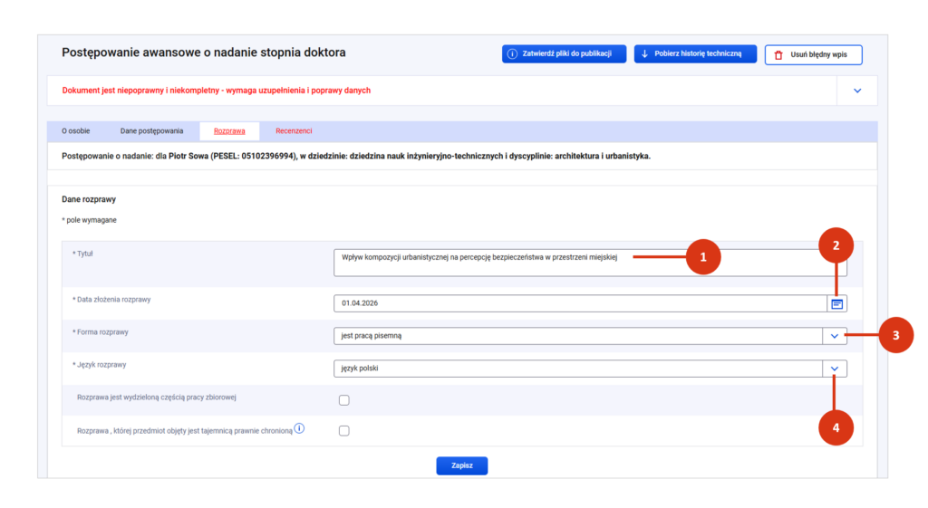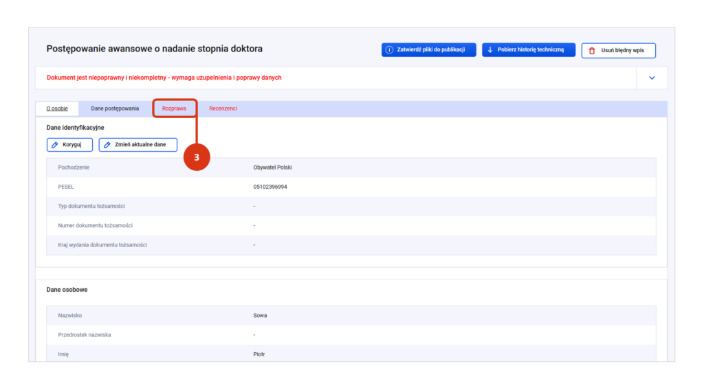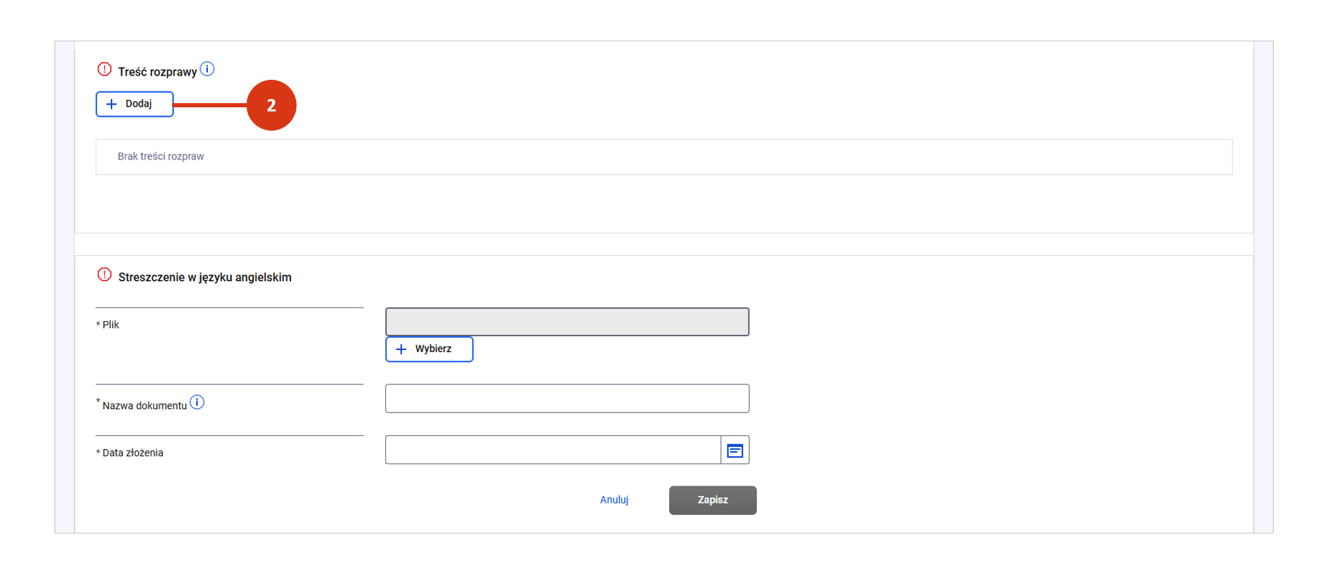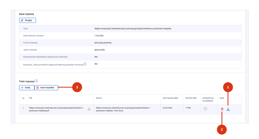 Jeśli wszystkie wymagane dane w tym pliki zostały dodane poprawnie, tytuł zakładki „Rozprawa” zmieni się z czerwonego na czarny.