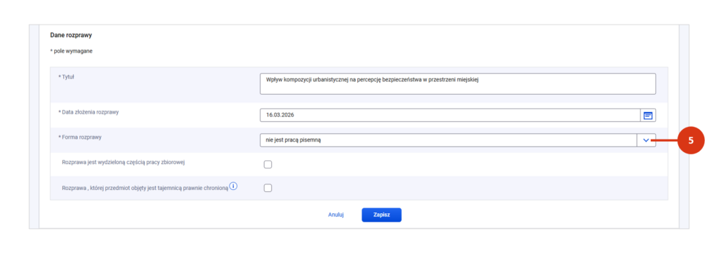 Jeżeli wybrałeś, że rozprawa nie jest pracą pisemną, nie dodajesz języka rozprawy [5].