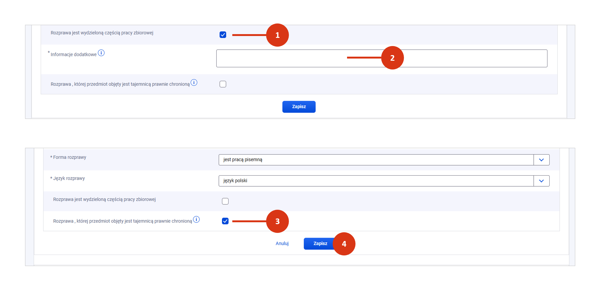 W kolejnym kroku możesz wskazać dodatkowe informacje dotyczące rozprawy.