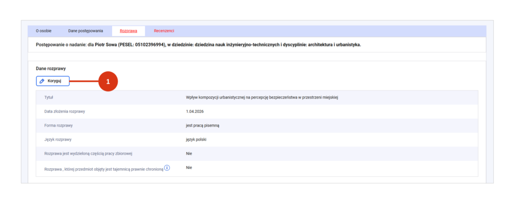 Jeśli zaznaczysz chceckbox „Rozprawa, której przedmiot objęty jest tajemnicą prawnie chronioną” [3], po zapisie przejdź do zakładki „Recenzenci” i dodaj w niej recenzje z wyłączeniem treści objętych tajemnicą.
