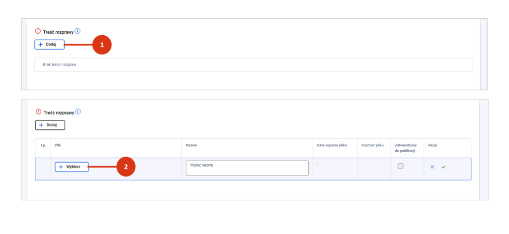 Aby dodać plik z rozprawą, która jest pracą pisemną użyj przycisku „Dodaj” [1]. Następnie kliknij w „Wybierz” [2] i wskaż właściwy plik z komputera.