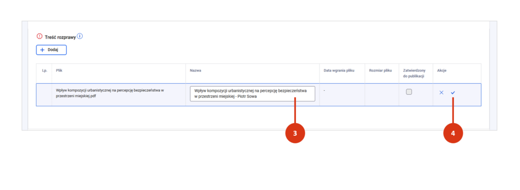 Wpisz nazwę pliku [3], pod jaką będzie on widoczny w bazie. Nazwa ta powinna być precyzyjna i jednoznaczna (jest to istotne zwłaszcza w przypadku rozpraw dodanych w wielu plikach).