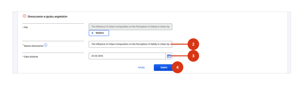 Wpisz nazwę pliku [2], pod jaką będzie on widoczny w bazie. Nazwa ta powinna być precyzyjna i jednoznaczna. Wskaż datę złożenia streszczenia [3] i zapisz dane przyciskiem [4].