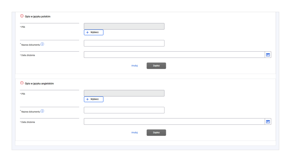 Po wskazaniu, iż rozprawa nie stanowi pracy pisemnej (w danych rozprawy) możesz dodać pliki z opisem pracy w języku polskim i angielskim. Dodanie pliku z opisem przebiega tak samo jak, dodanie pliku streszczenia rozprawy pisemnej opisane powyżej.