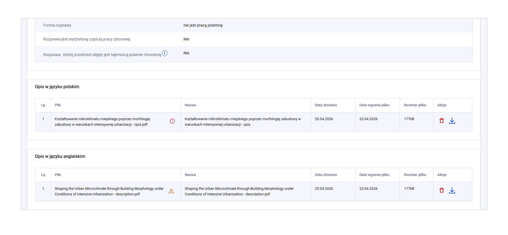 W przypadku rozprawy niebędącej pracą pisemną zamiast pliku z treścią rozprawy dodaje się pliki z opisem pracy w języku polskim i angielskim.
