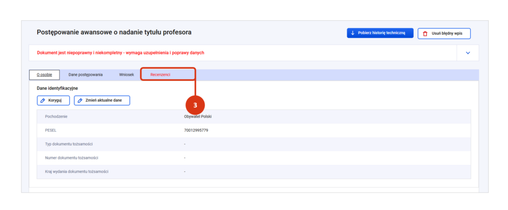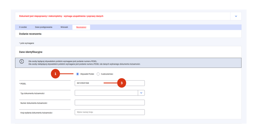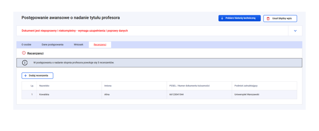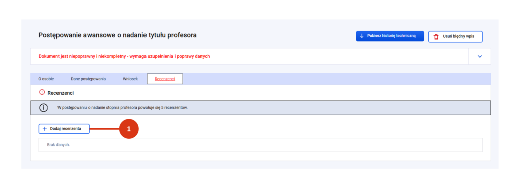 Po rejestracji zakładka „Recenzenci” będzie oznaczona kolorem czerwonym – oznaczającym niekompletny lub niepoprawny stan danych. Więcej o weryfikacji poprawności danych postępowania przeczytasz tutaj.