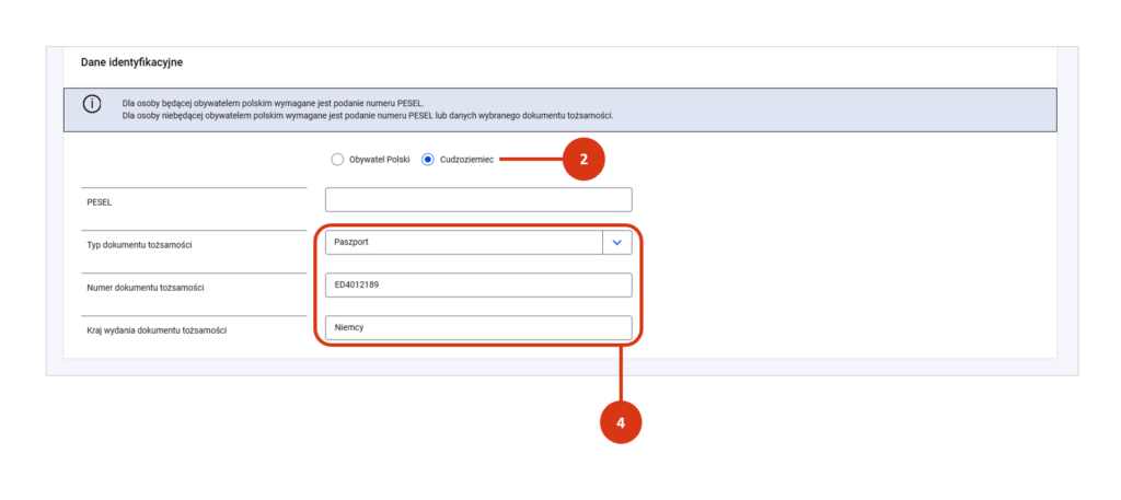 - wskaż typ dokumentu tożsamości, wprowadź jego numer i kraj wydania – w przypadku cudzoziemca, który nie posiada PESELa [4].