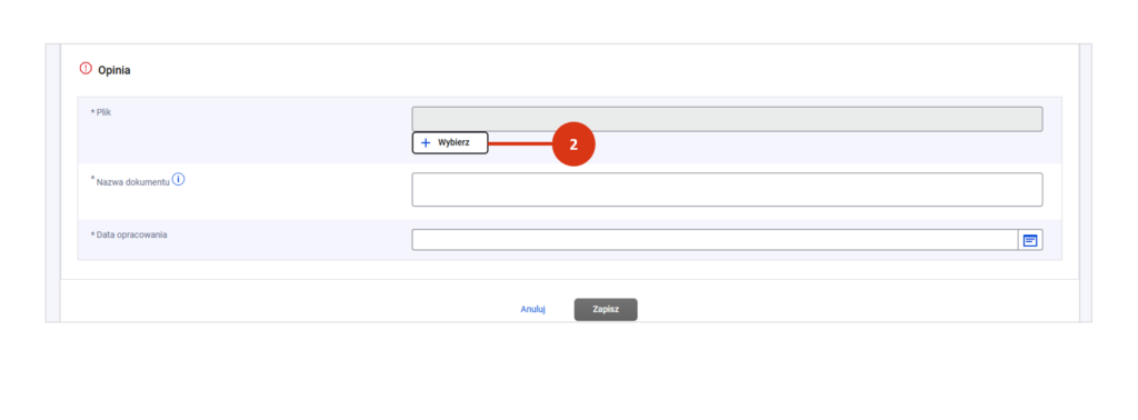 W danych recenzenta w sekcji „Opinia” użyj przycisku „Dodaj opinię” [1]. Następnie kliknij w „Wybierz” [2] i wskaż właściwy plik z komputera.