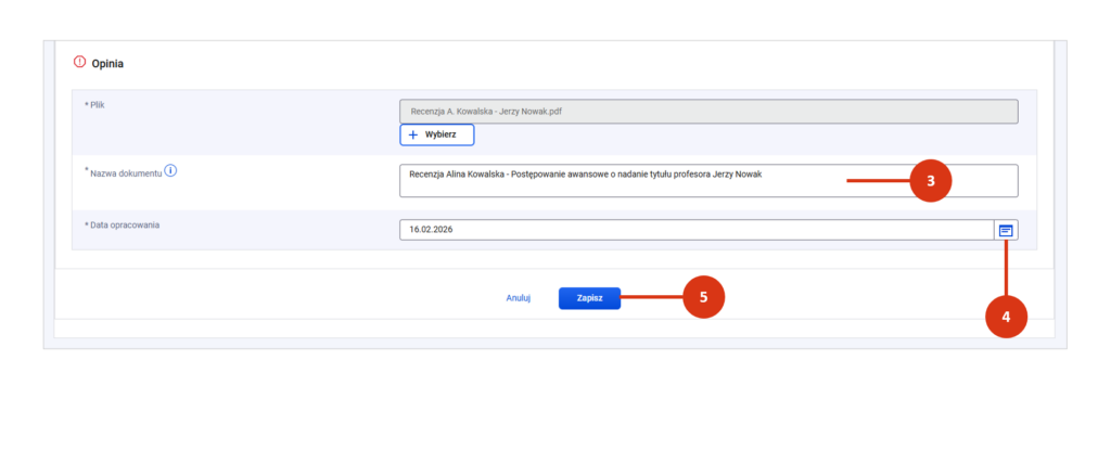 Wprowadź datę opracowania opinii [4] i zapisz formularz [5].