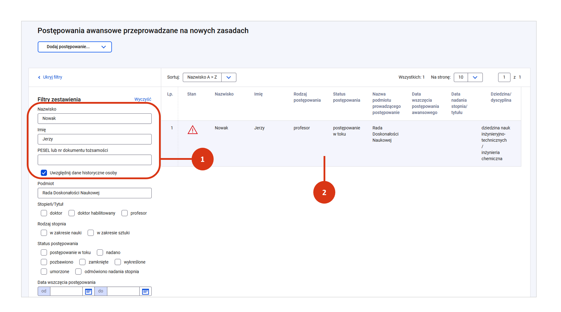 Aby wprowadzić dane recenzentów w postępowaniu o nadanie tytułu profesora, wyszukaj właściwe postępowanie w wykazie [1], a następnie przejdź do jego szczegółów [2].