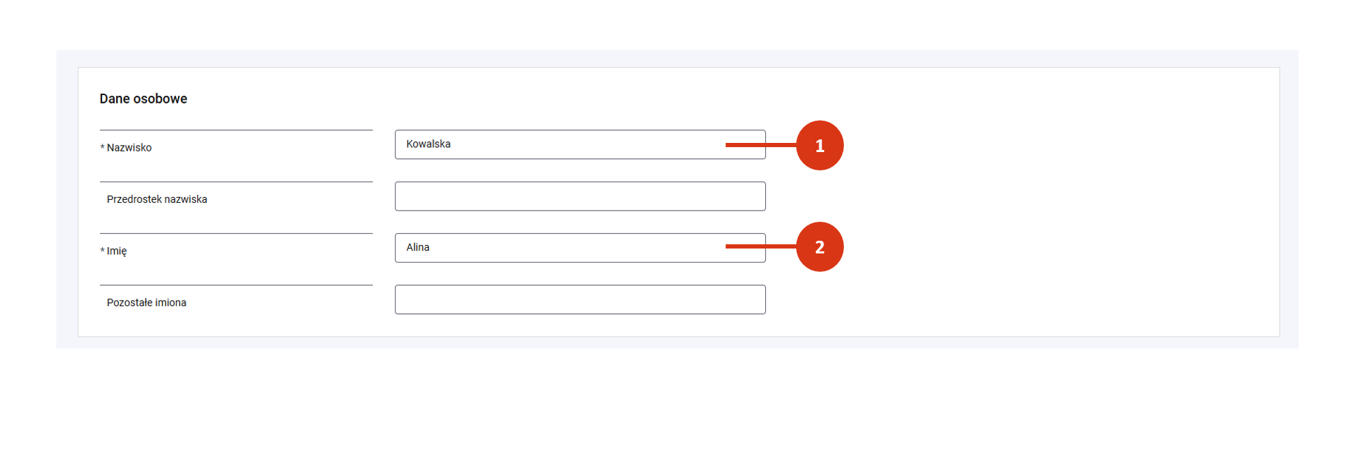 Wprowadź wymagane dane osobowe – nazwisko [1] i imię [2].
