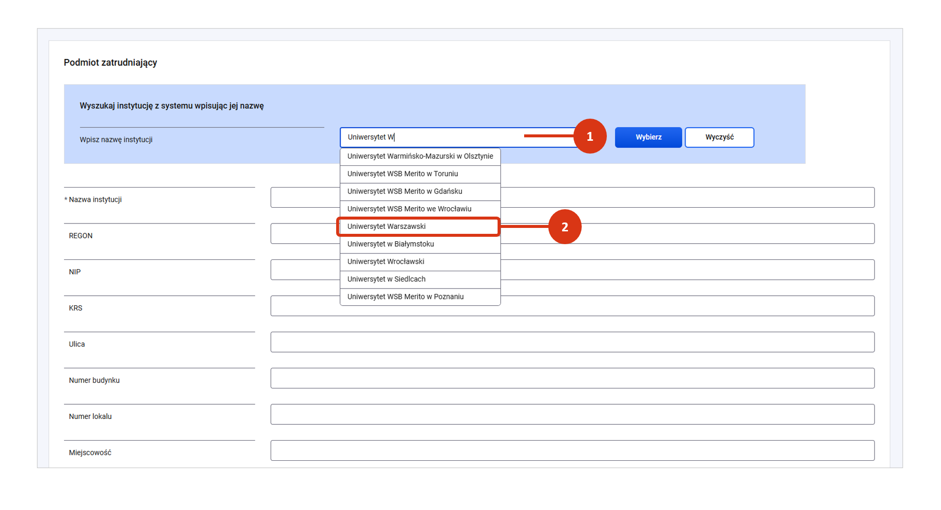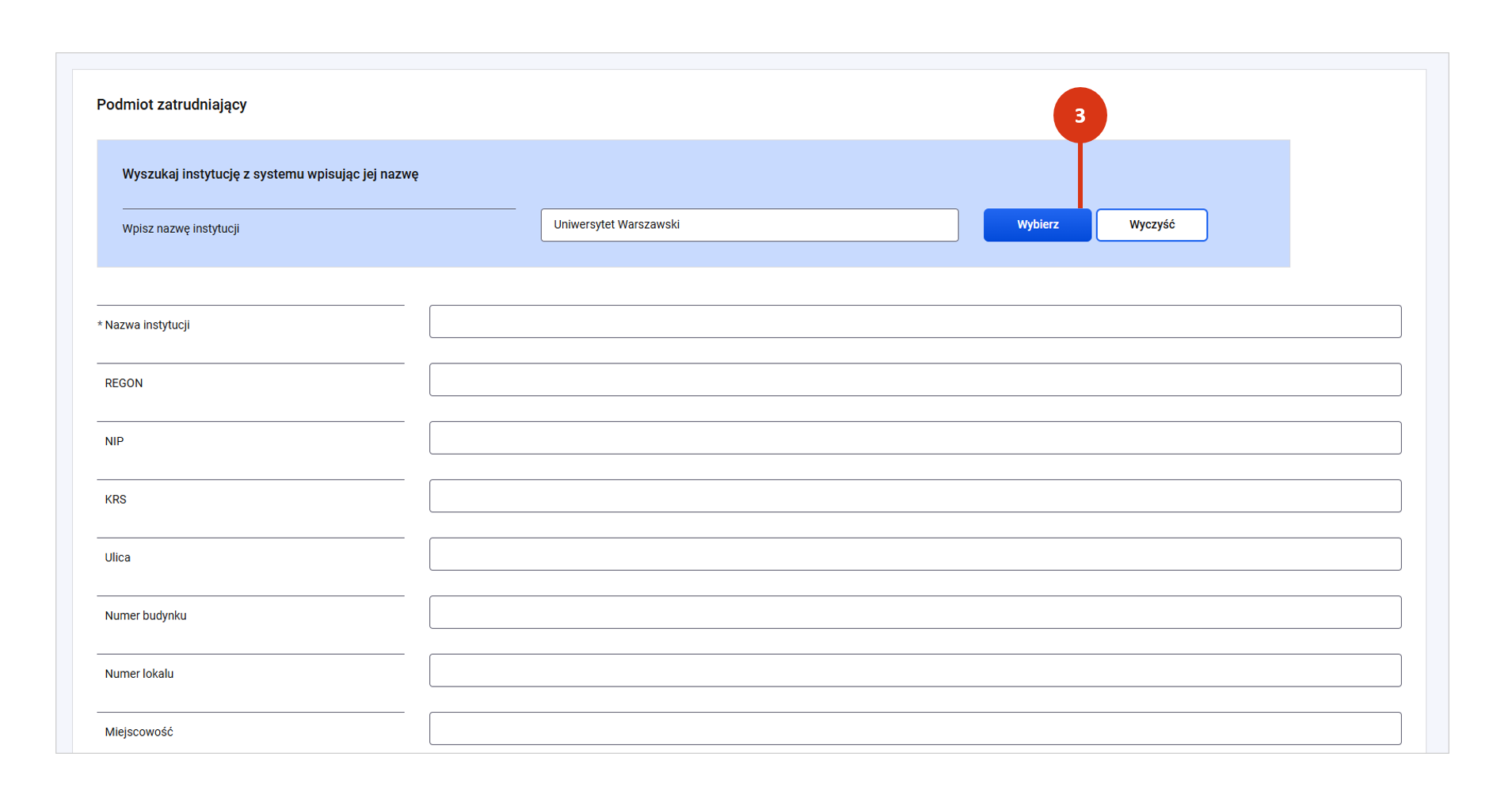 - Jeśli recenzent jest zatrudniony przez podmiot wchodzący w skład polskiego systemu szkolnictwa wyższego i nauki, to wpisz nazwę instytucji w okno [1], wskaż właściwy podmiot z podpowiedzi systemu [2] i potwierdź przyciskiem „Wybierz” [3]. System wprowadzi dane podmiotu zatrudniającego z rekordu w POL-onie.