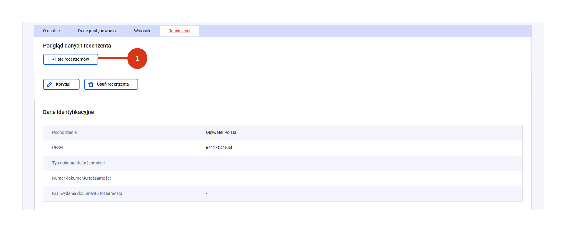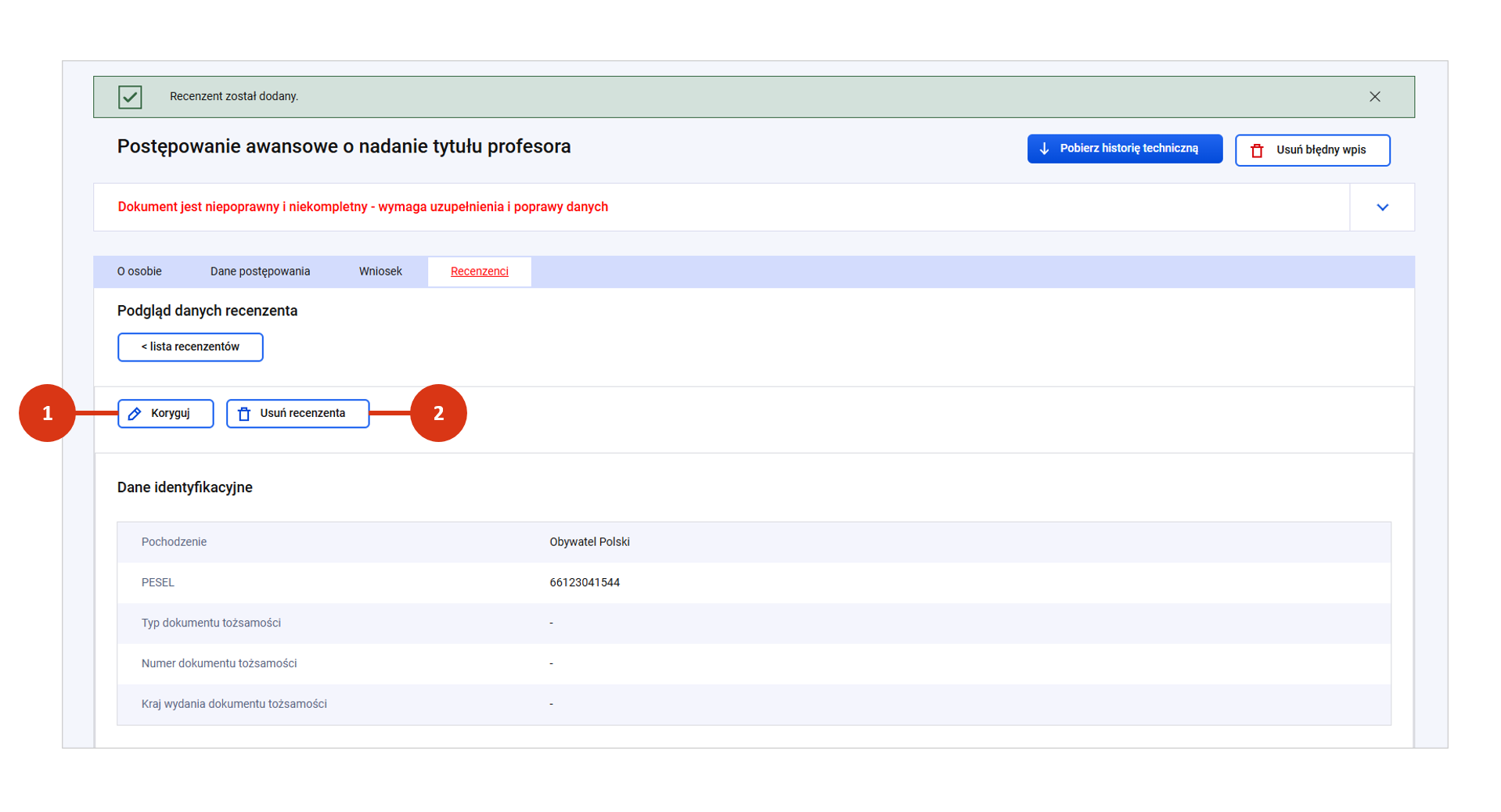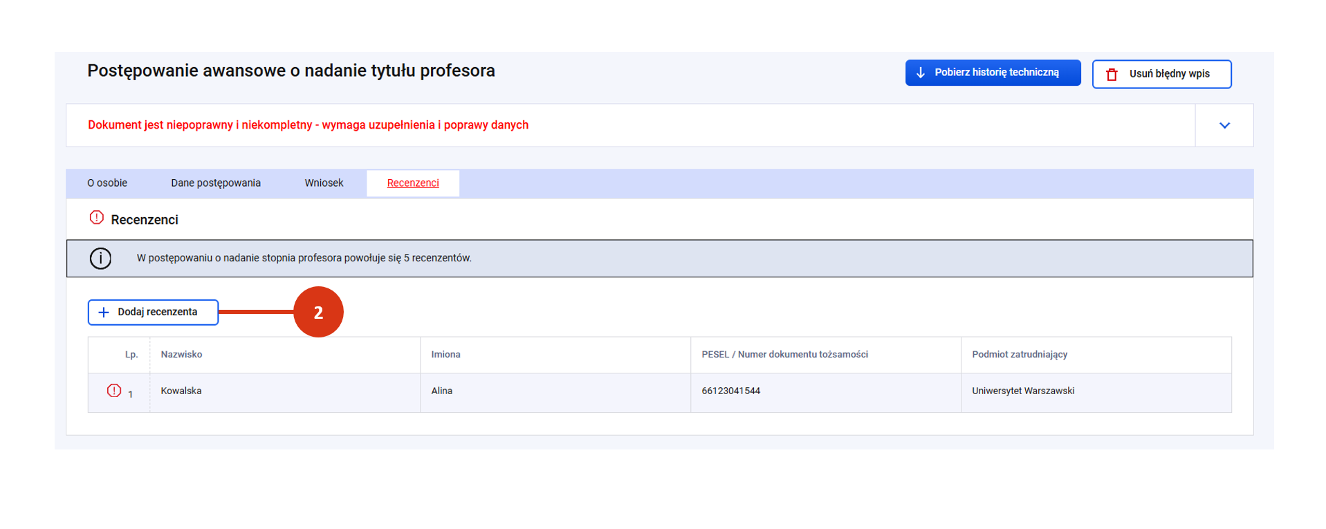 Po rejestracji zakładka „Recenzenci” będzie oznaczona kolorem czerwonym – oznaczającym niekompletny lub niepoprawny stan danych. Więcej o weryfikacji poprawności danych postępowania przeczytasz tutaj.