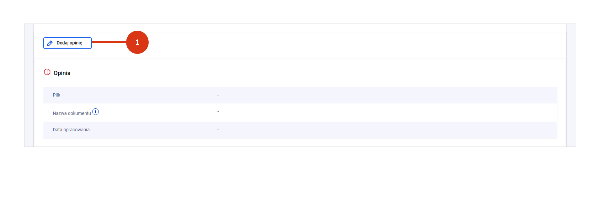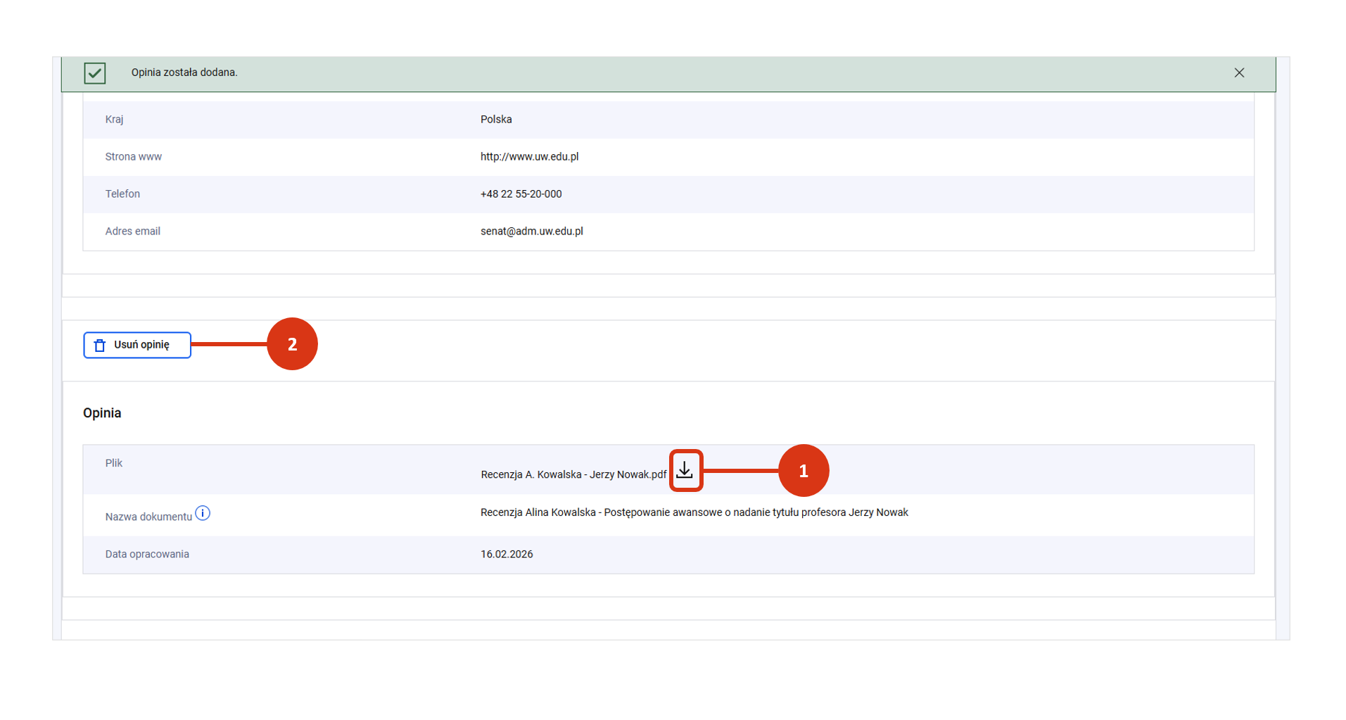 W danych recenzenta w sekcji „Opinia” użyj przycisku „Dodaj opinię” [1]. Następnie kliknij w „Wybierz” [2] i wskaż właściwy plik z komputera.