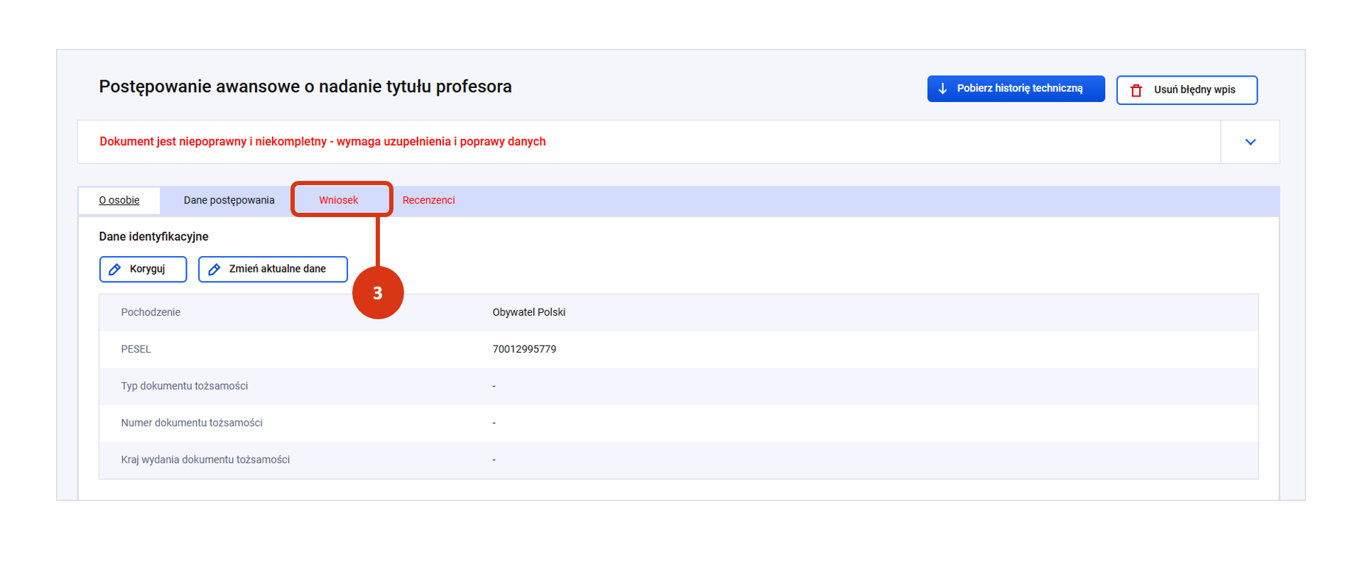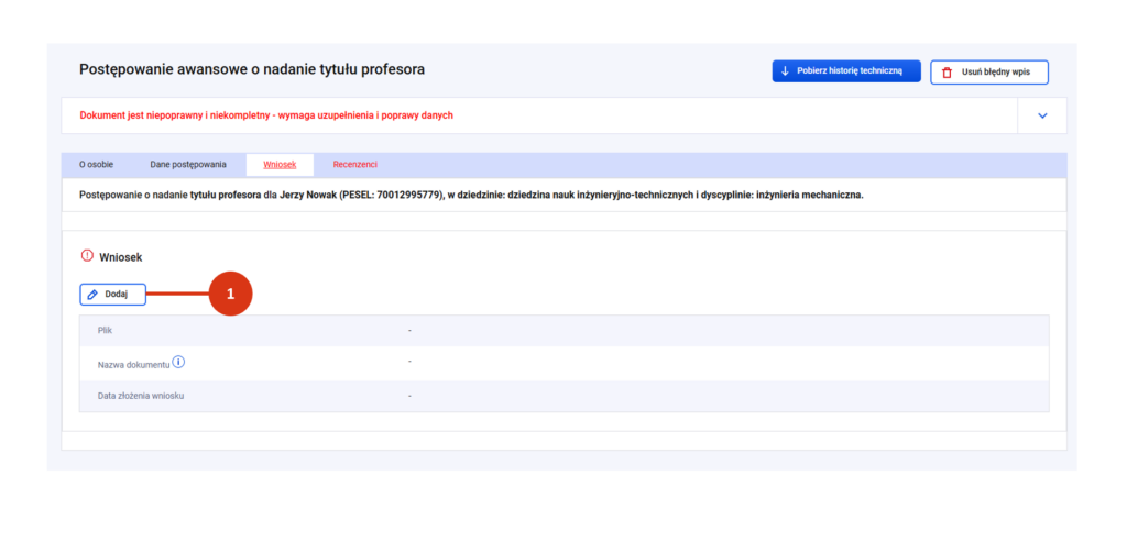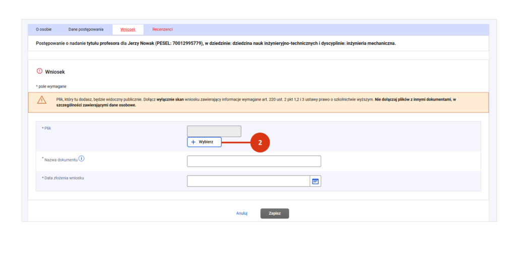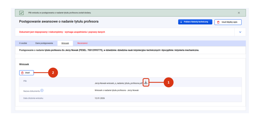 Przy zapisie system zweryfikuje czy plik ma właściwy format i wielkość oraz czy data złożenia wniosku nie jest późniejsza niż data wszczęcia postępowania o nadanie tytułu profesora.