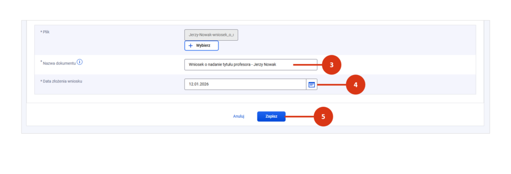 Wpisz nazwę pliku [3], pod jaką będzie on widniał w bazie dokumentów postępowań awansowych. Nazwa pliku powinna być precyzyjna i jednoznaczna.