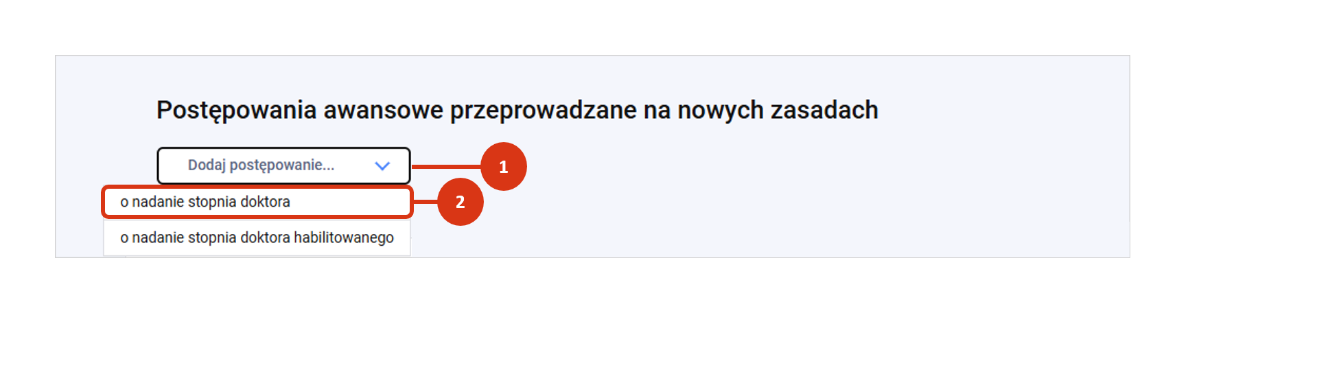 Kliknij w przycisk „Dodaj postępowanie…” [1] i wskaż ścieżkę postepowania o nadanie stopnia doktora [2].