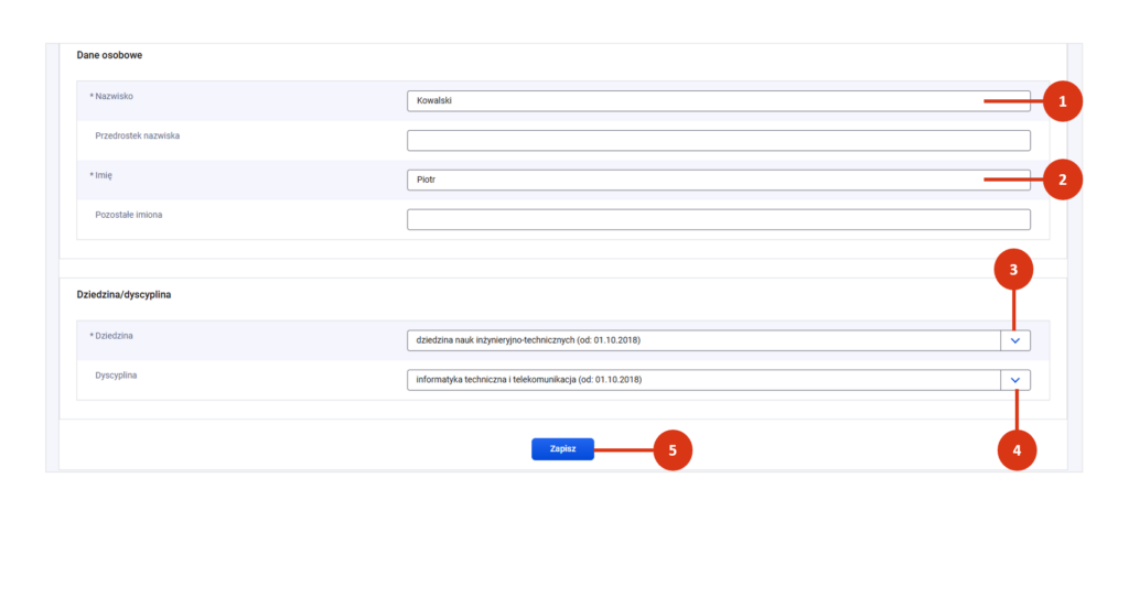 Wskaż obowiązkowo dziedzinę, w której osoba ubiega się o stopień [3]. Po wskazaniu dziedziny możesz wybrać dyscyplinę [4]. Będą to dziedzina i dyscyplina, w których przygotowywana jest rozprawa doktorska. Na koniec zapisz formularz [5]. System zweryfikuje poprawność i kompletność postępowania.