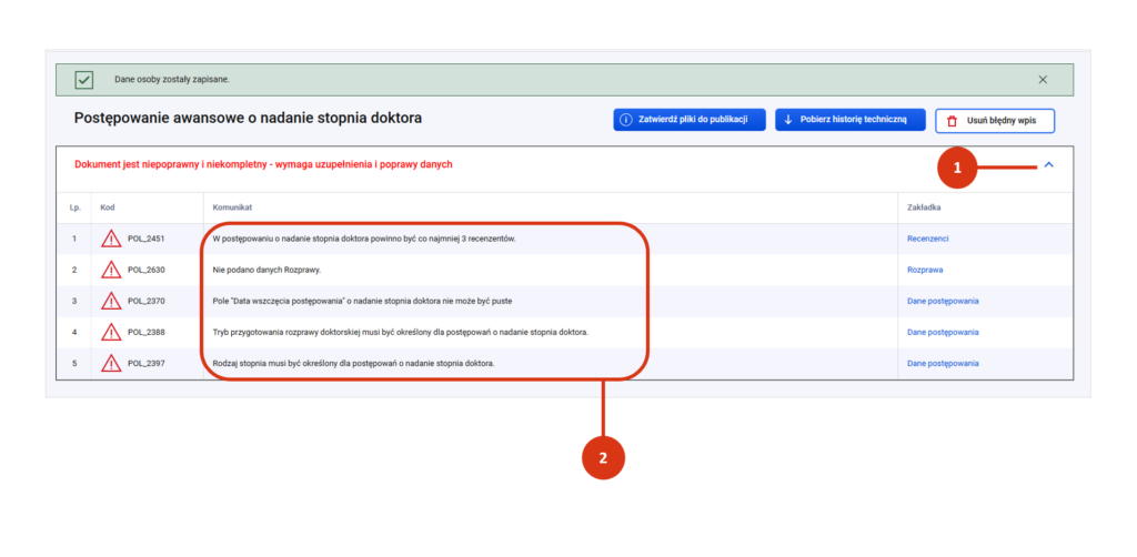 Kliknij w wiersz „Dokument jest niepoprawny i niekompletny – wymaga uzupełnienia i poprawy danych” [1] i zapoznaj się z komunikatami błędu [2].
