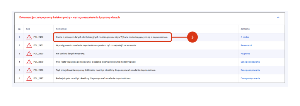 Osoba, dla której rejestrujemy postępowanie o nadanie stopnia doktora, musi znajdować się w wykazie osób ubiegających się o stopień doktora [3]. Jest to obowiązek niezależny od rejestracji postępowania w postępowaniach awansowych. W przypadku wystąpienia komunikatu braku kandydata w module Osoby ubiegające się o stopień doktora należy uzupełnić rekord zgodnie ze ścieżką opisaną tutaj.