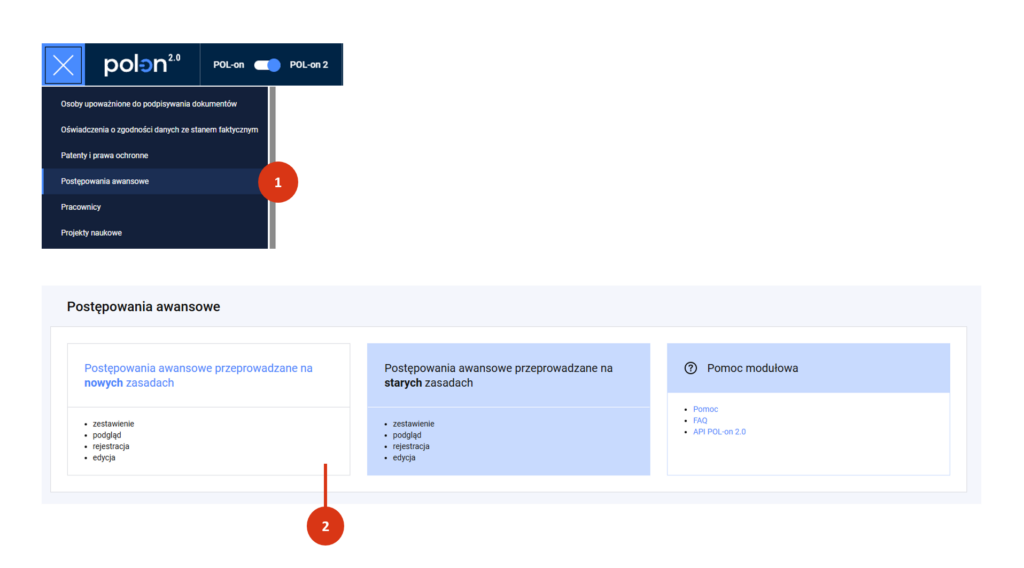 Aby zarejestrować postępowanie o nadanie stopnia doktora zaloguj się do POL-on 2.0. Wybierz z menu moduł Postępowania awansowe [1]. Następnie wybierz kafel „Postępowania awansowe przeprowadzane na nowych zasadach” [2].